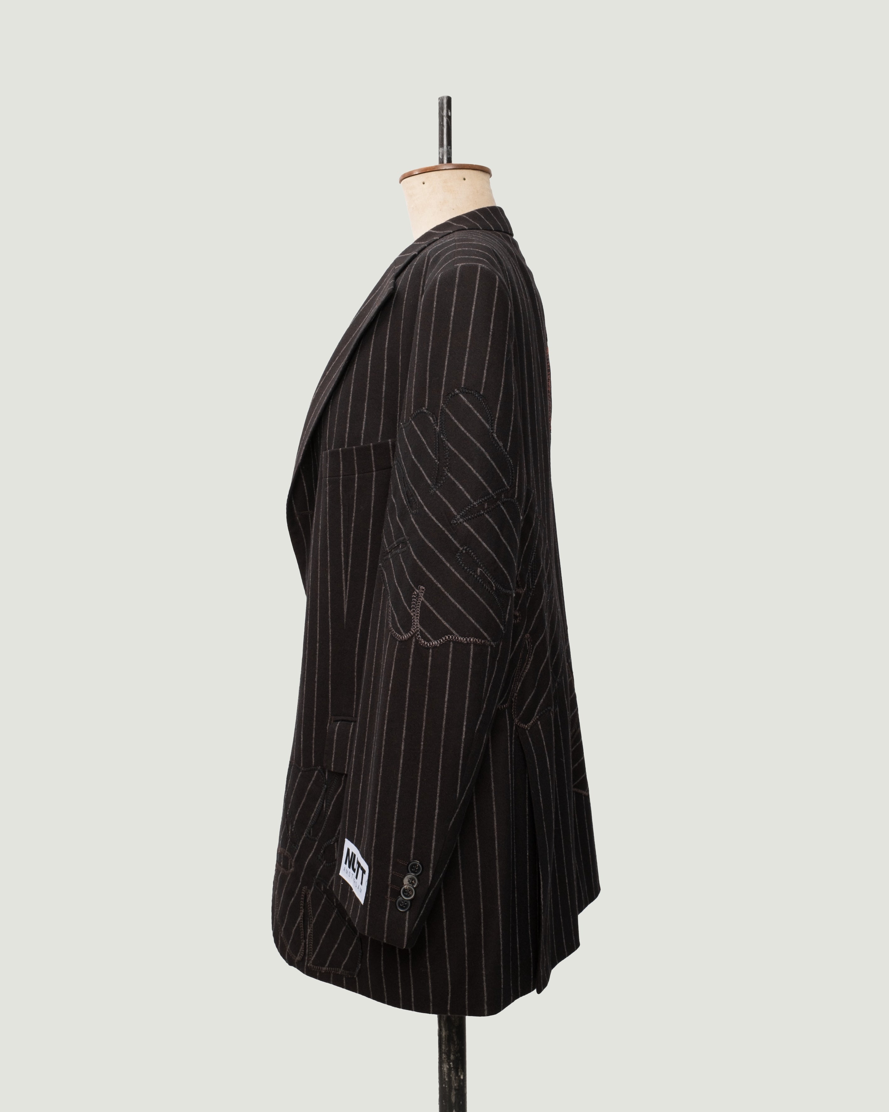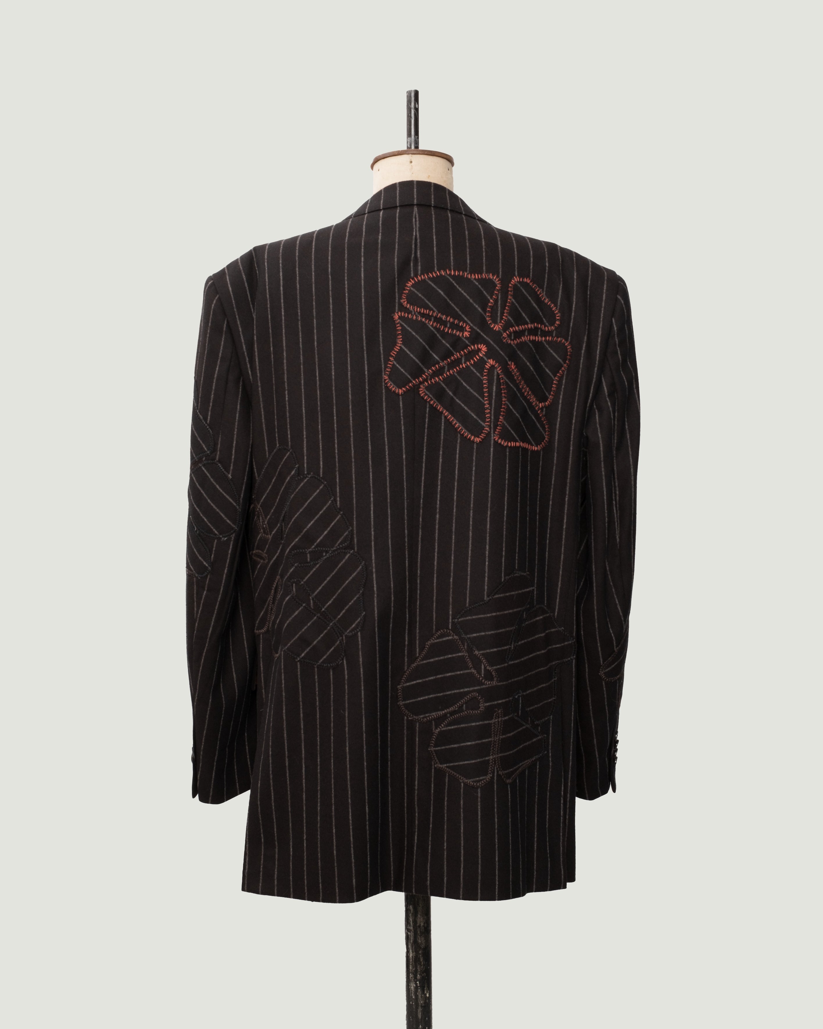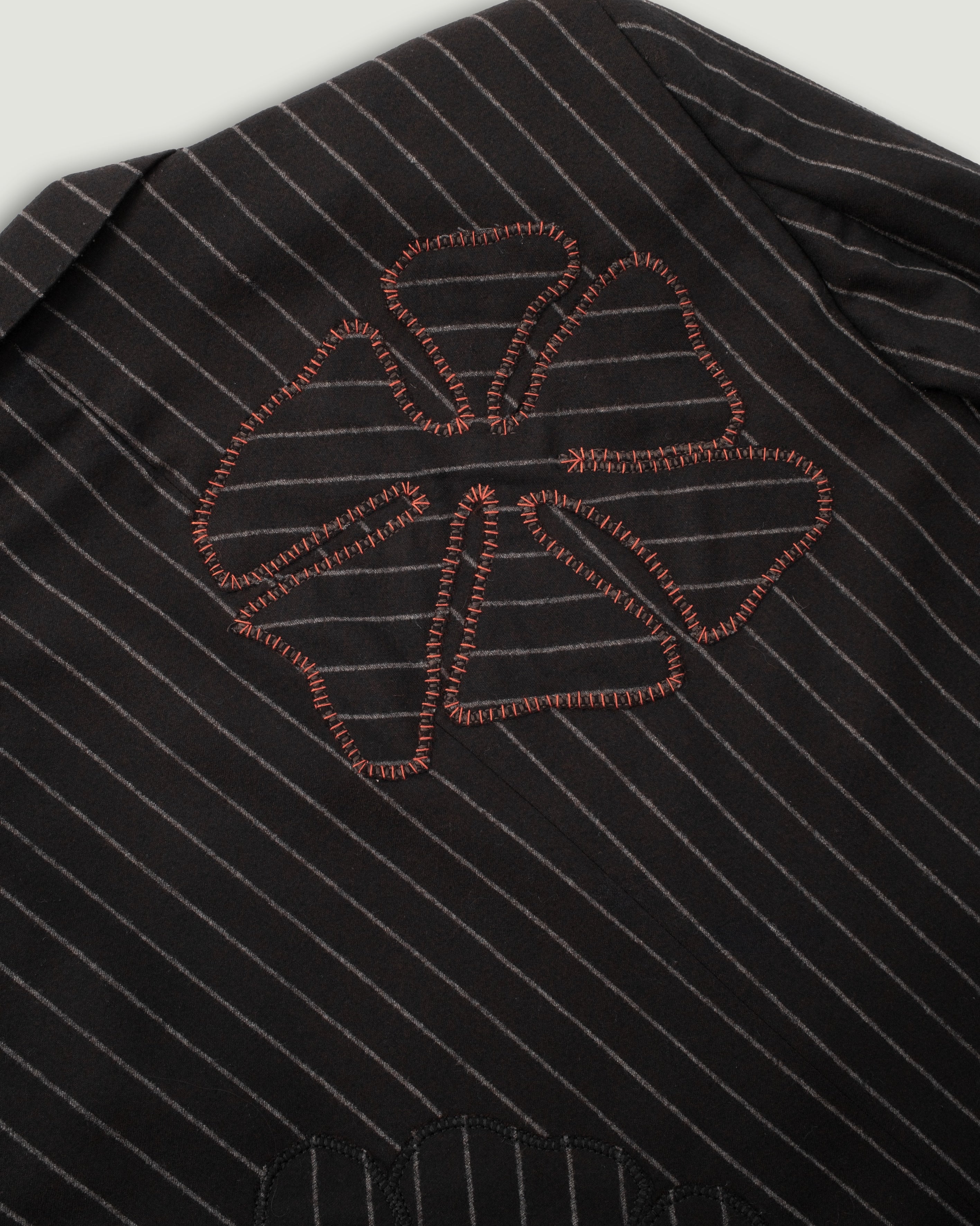 ORANGE BLOOM, een one-off statement jas gemaakt van een bruine wollen, vintage krijtstreep en een nooit meer gedragen oranje windjack, herboren met opvallende oranje voeringen. De handgeborduurde bloemen geven een eigenwijze, rebelse touch en de oranje binnensluiting geeft hem meer pit. Draag hem over jeans voor nonchalante coolness of over een jurk voor instant chic.